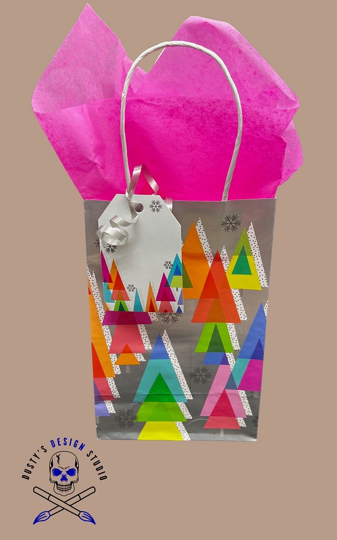 Includes gift bag, tissue paper, and gift tag attached with ribbon.
