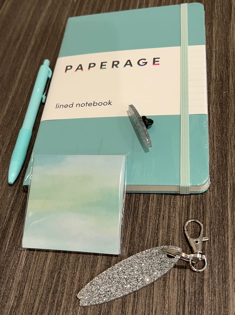 Pack comes with a journal, pen, sticky notes, acrylic surfboard keychain, acrylic pin in matching hues.